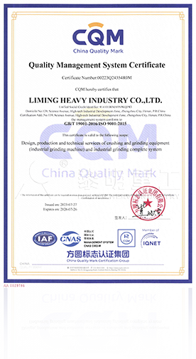 Liming est certifié ISO (ISO9001:2000), CE (Union européenne) et ERC (Russie) pour ses machines destinées à l'industrie minière. Après plus de 30 ans d'efforts, la marque de broyeurs, fours et concasseurs s'est hissée au sommet de l'industrie, et LIMING est très appréciée par ses clients, anciens et nouveaux, en Chine et à l'étranger.