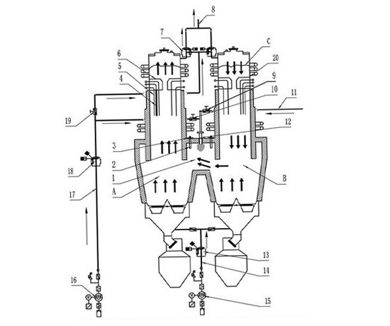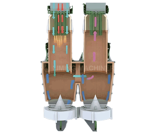 Le four à double tambour calcine le calcaire à l'aide de deux chambres. Les tambours A et B sont reliés au bas de la zone de calcination, et le matériau descend à travers les deux tambours. Pendant la calcination dans le tambour A, l'air de combustion et le combustible s'écoulent parallèlement au matériau dans le tambour A, permettant à la flamme chaude d'entrer en contact avec le matériau plus froid et hautement endothermique. À l'inverse, les gaz de combustion à température relativement plus basse interagissent avec le matériau progressivement calciné, ce qui permet d'obtenir des conditions de calcination uniformes et un rendement thermique élevé. Les produits de combustion et le CO₂ libérés par la décomposition du matériau passent par le canal de connexion vers le puits B. À ce stade, le puits B agit comme une chambre de régénération, où le calcaire à l'intérieur absorbe la chaleur des gaz d'échappement, tandis que les gaz d'échappement sont refroidis à une température relativement basse. Le matériau stocke la chaleur, qui est ensuite utilisée pour préchauffer l'air de combustion pour le cycle suivant. Dans cette configuration, le puits A sert de puits de combustion, reflétant la caractéristique d'écoulement parallèle, tandis que le puits B fonctionne comme un puits régénératif avec des propriétés de stockage de chaleur. Au cycle suivant, les rôles s'inversent : le puits A devient la chambre de régénération et le puits B devient le puits de combustion. Cela permet une calcination continue du calcaire.
